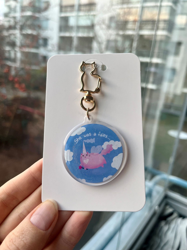 Add a touch of magic to your day! 💖☁️ This adorable keychain features a chubby pink fairy cat floating among the clouds. Made of durable acrylic and coated with sparkling glitter epoxy, the design is visible on both sides. The cat-shaped clasp adds an extra charming detail. A perfect gift for dreamers and magic lovers! 🧚‍♀️🐾